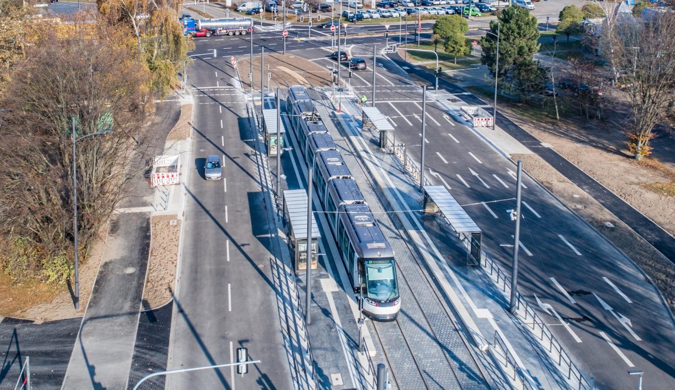 Punkt 9 Uhr ist die Tram am 17. Oktober 2018 zu ihrer ersten Testfahrt auf der Strecke zwischen der bisherigen Endhaltestelle Bahnhof und dem künftigen Haltepunkt Rathaus gestartet. Die Fahrt im Schritttempo und ohne Passagiere wurde von einem ganzen Heer von Technikern begleitet, darunter auch Baubürgermeister Harald Krapp und Tiefbauingenieurin Ilona Jetschmanegg vom städtischen Bereich Tiefbau. Der Technische Geschäftsführer der CTS, Alain Giesi, überwachte die erste Fahrt einer neuen Citadis, dem neuesten Straßburger Tram-Model im Europa-Design natürlich ebenfalls persönlich.