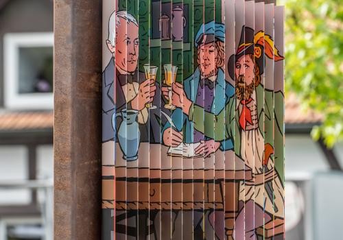 Auf fünf Stelen bringt der Künstler und Grafiker Reinhold Schäfer auf pfiffige Weise 15 Bilder unter. Die Bilder und die Geschichte, die sie illustrieren, „sollen alle ansprechen“ und deshalb suchte Reinhold Schäfer nach einer Möglichkeit, ihnen Leben einzuhauchen: „Der Schlüssel zur Lebendigkeit ist die Bewegung“, lautet sein Kredo und so zerlegte er seine Zeichnungen in schmale Streifen, die als Folien auf Lamellen aufgebracht wurden. Auf diese Weise sieht der Betrachter drei unterschiedliche Bilder, je nachdem, ob er von rechts, von links oder frontal auf die Stelen blickt. Weitere Informationen zu den Stelen finden sich auf der Internetseite der Vereins für Heimatpflege.