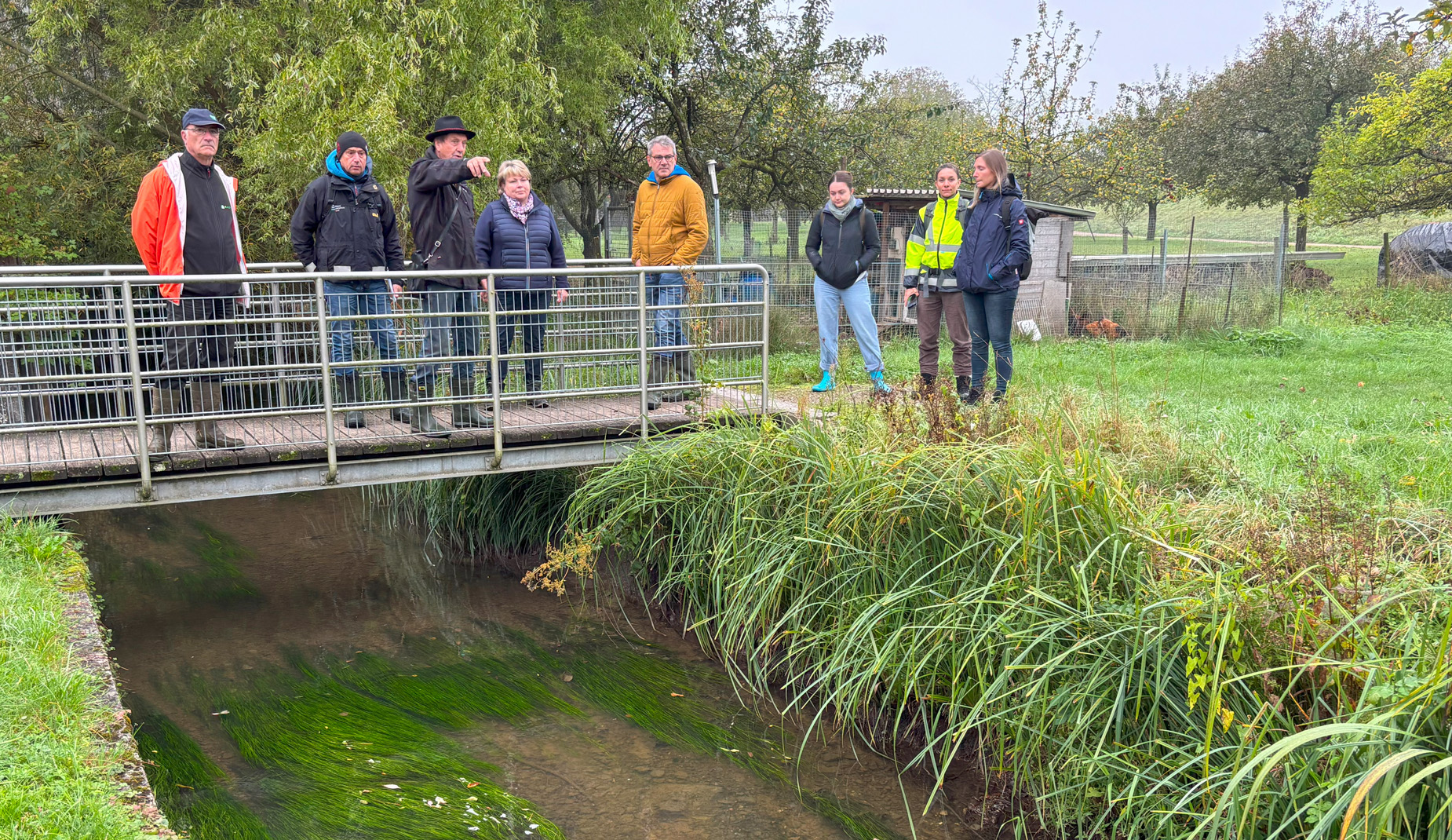Begutachteten gemeinsam den Zustand des Alten Gießelbachs: Waldemar Jockers (Ortsvorsteher Holzhausen), Alexander Sirch (Zweckverband HWS Hanauerland und städtischer Gewässertechniker), Heinz Faulhaber (Ortsvorsteher Leutesheim), Annemarie Ehrhardt (Ortsvorsteherin Zierolshofen), Oberbürgermeister Wolfram Britz sowie vom Landratsamt Ortenaukreis Caroline Lauber, Noeemi Rahner und Sara Braun. (v.l.n.r.)