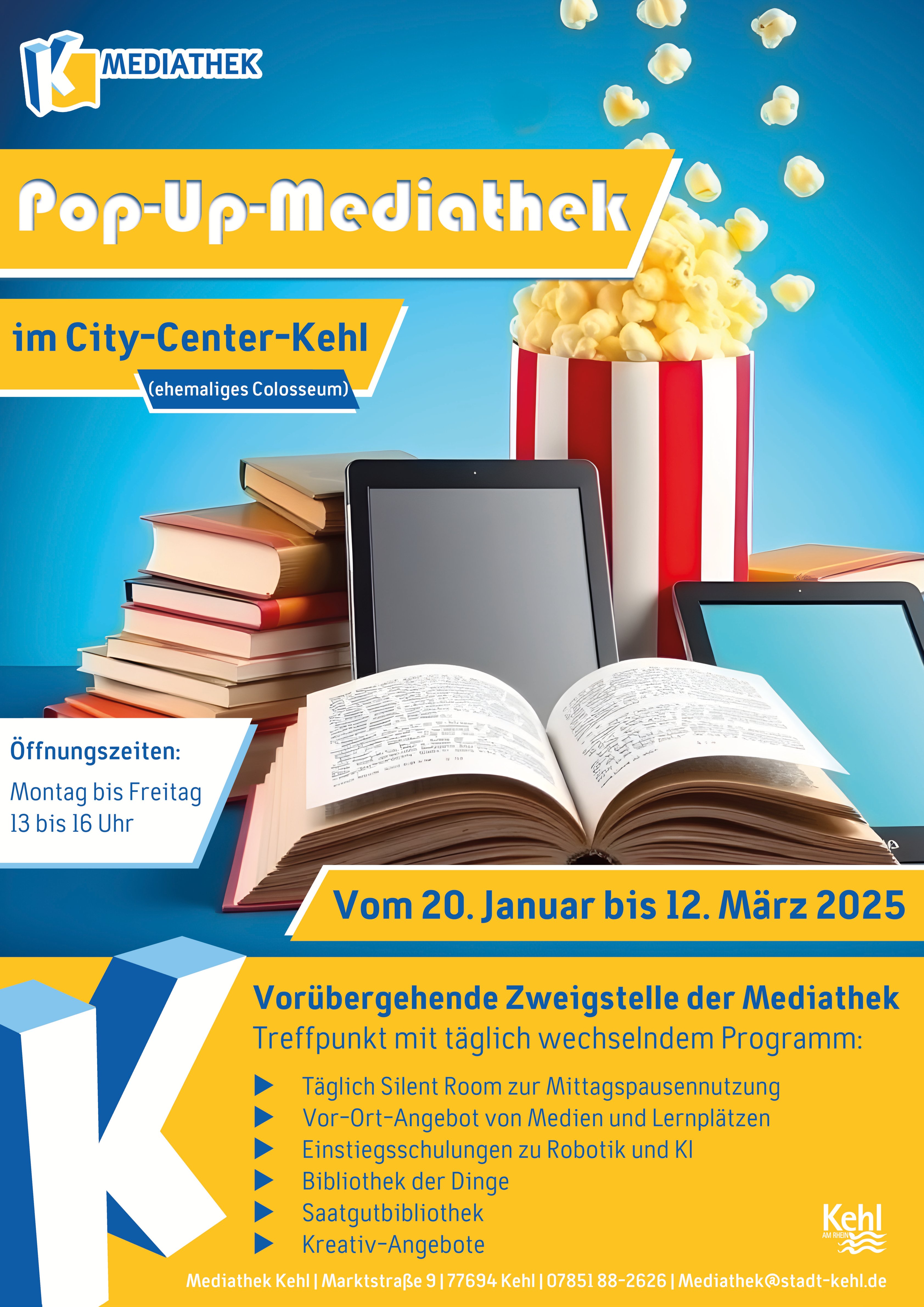 Die Mediathek unterhält seit Montag, 20. Januar 2025, mitten im City Center eine Zweigstelle. Die Pop-Up-Mediathek ist bis zum 12. März 2025 immer von Montag bis Freitag von 13 bis 16 Uhr geöffnet und macht in dieser Zeit besondere Angebote.