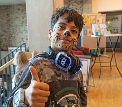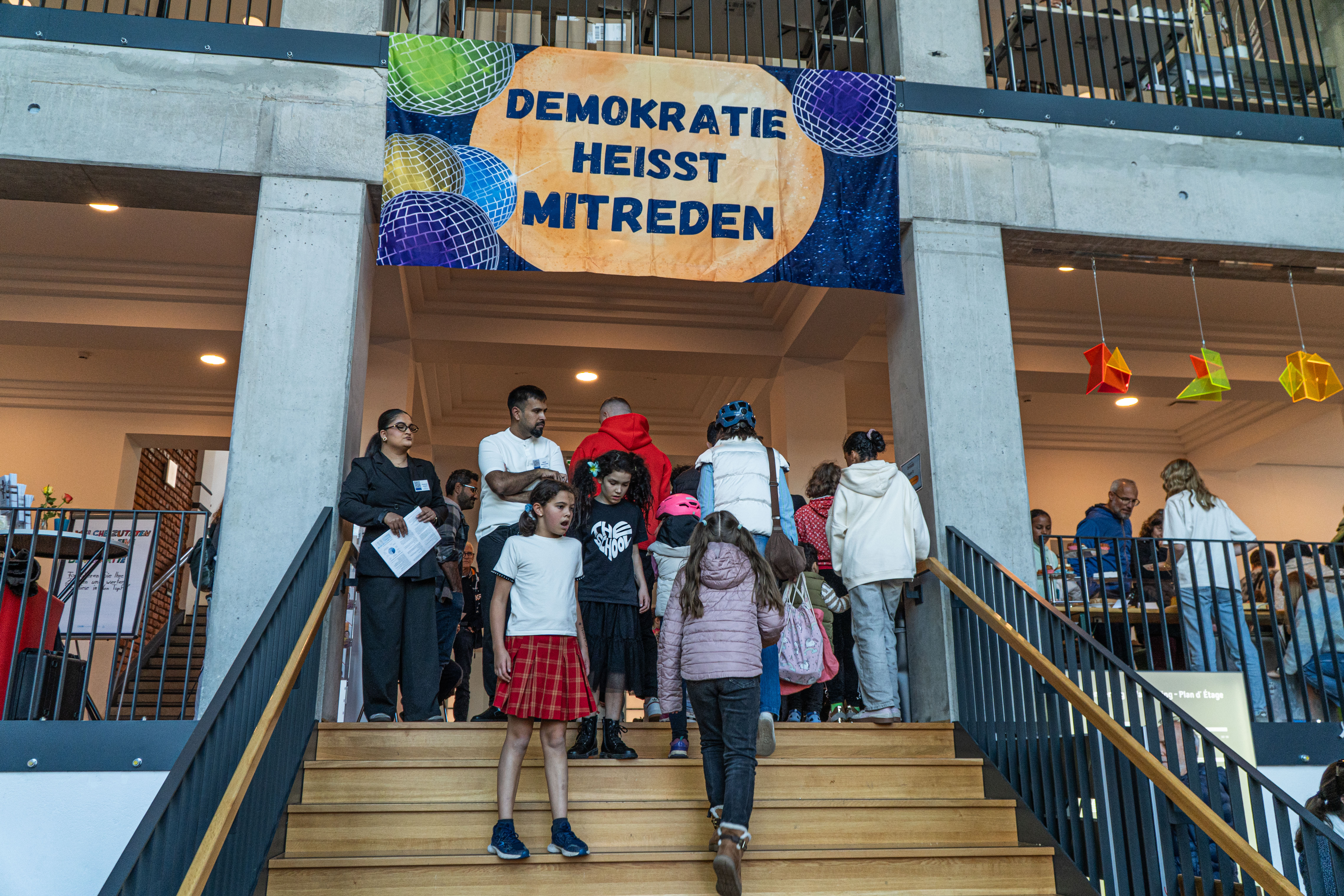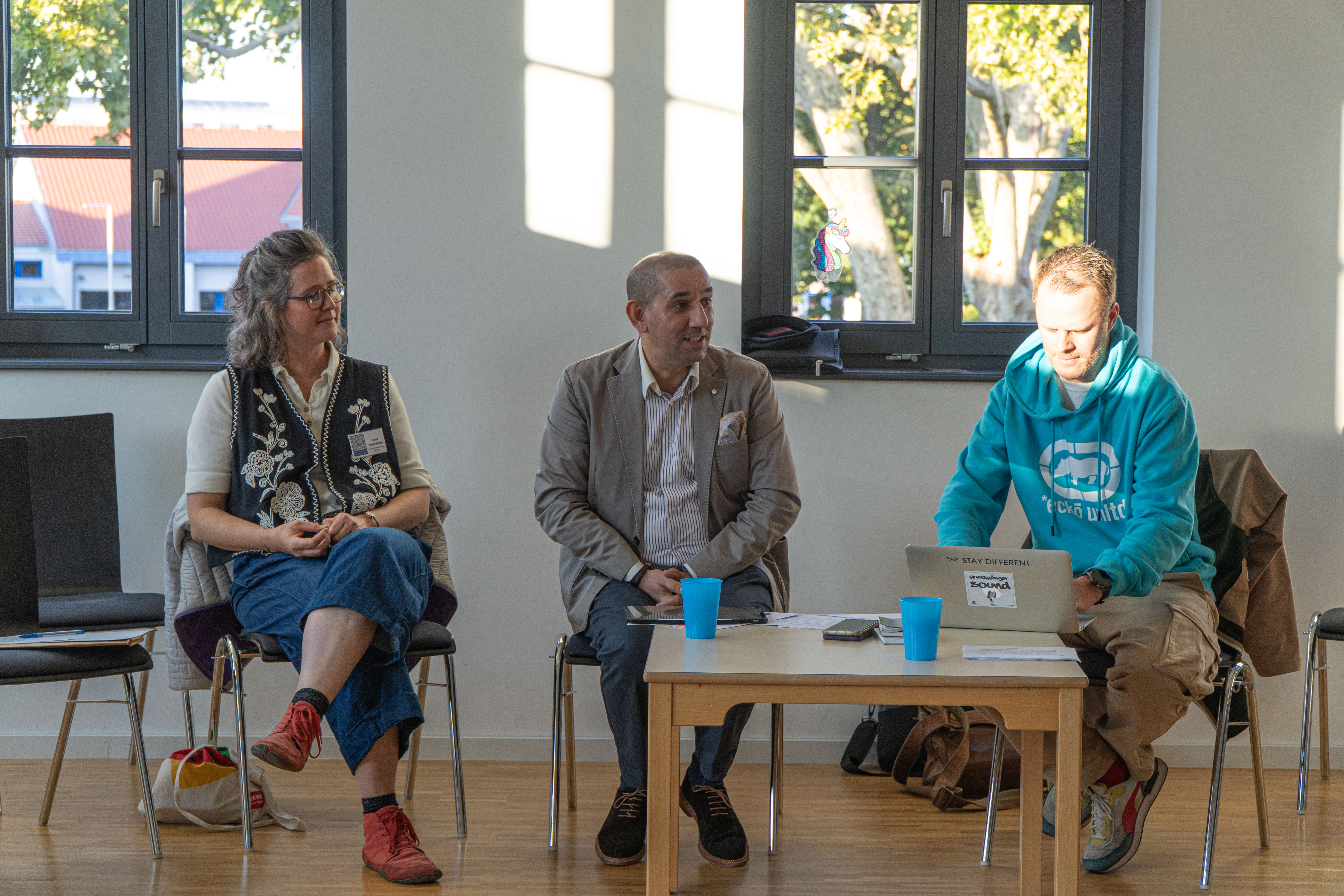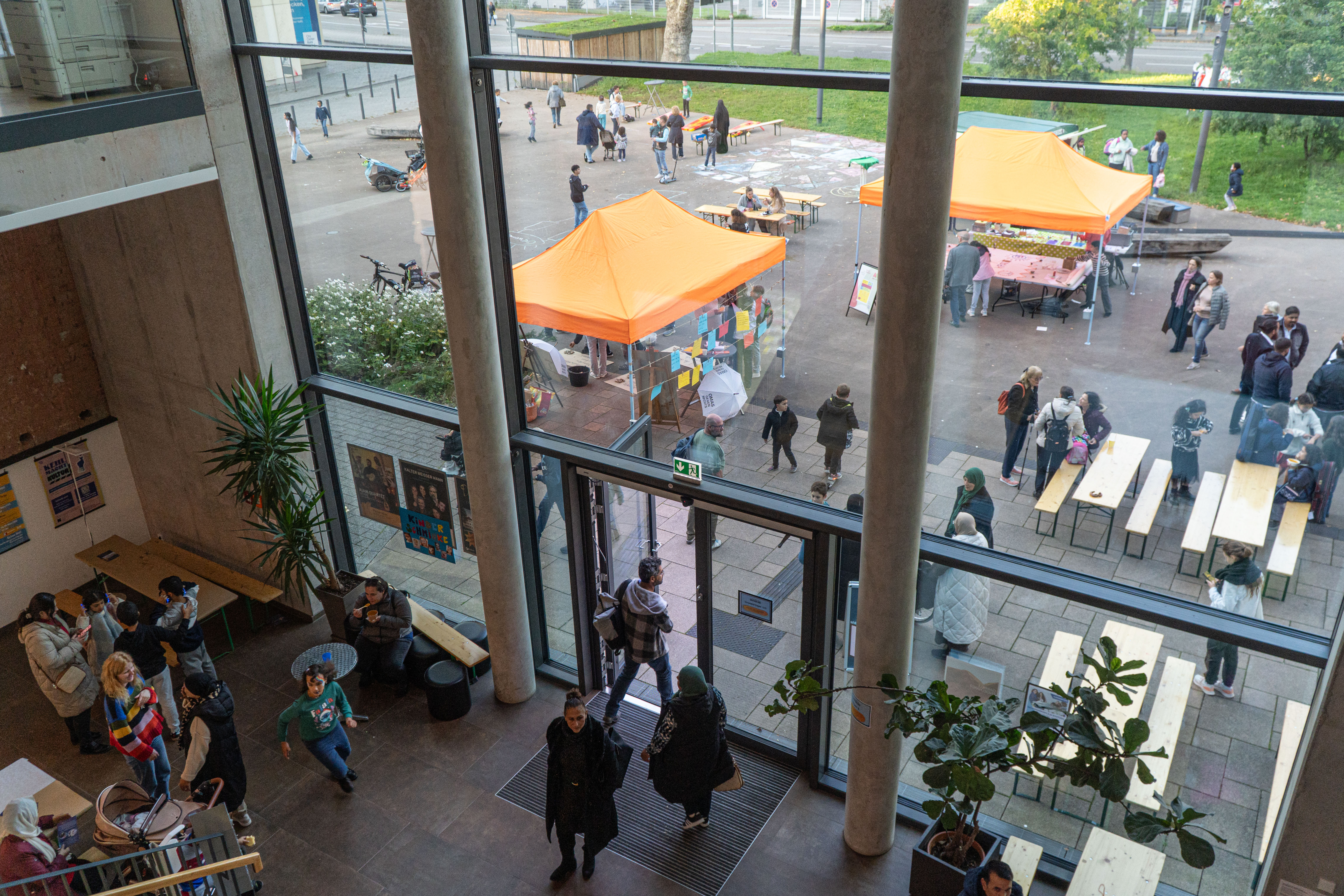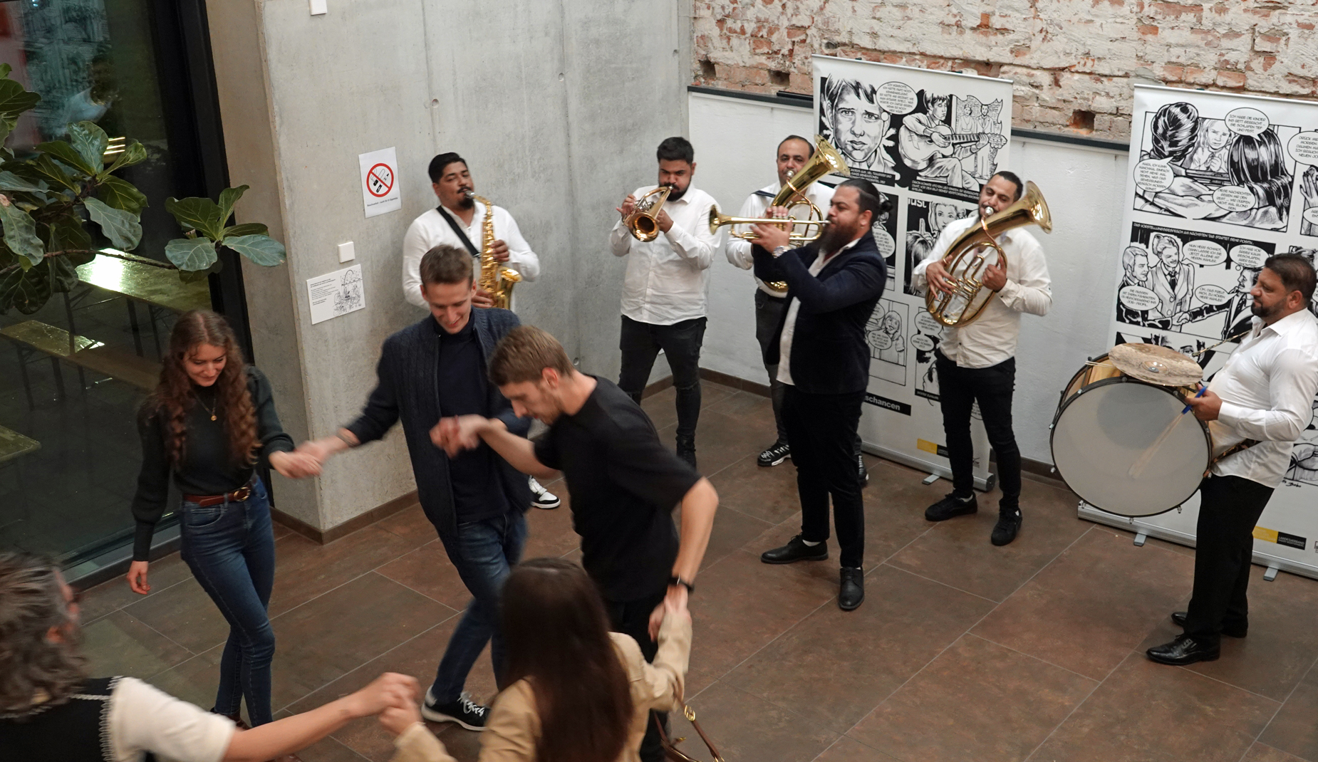 Auch mitmachen war gefragt: Bei einem Quiz konnten Interessierte ihr Wissen zum Grundgesetz unter Beweis stellen. Mehr über die Lebenswirklichkeit von Sinti und Roma konnten Besucherinnen und Besuche bei einer Comicausstellung erfahren. Aber auch für die kleinsten Gäste war gesorgt: Neben Kinderschminken im Foyer und dem Malen mit Kreide auf dem Kulturhausvorplatz wurden im Dachgeschoss Gesellschaftsspiele angeboten. Musikeinlagen gab es ebenfalls zu hören. Der städtische Inklusionsbeauftragte Nicolas Uhl gab unter seinem Pseudonym „Drive-by“ eigene Raps zum Besten und das Balkan Brass Orchestra sorgte nicht nur für ausgelassene Stimmung, sondern erläuterte gemeinsam mit Markus Dalfeld die sogenannte Sinti-Hymne.