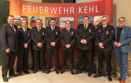 Zählt man die Ehrungen für 15, 25, 40 und 50 Jahre aktiven Dienst in der Kehler Feuerwehr vom Freitagabend zusammen, so steht unter dem Strich die stolze Zahl von 905 Jahren Dienst an der Allgemeinheit, erklärte Feuerwehrkommandant Viktor Liehr den Feuerwehrangehörigen und ihren Ehrengästen in der Korker Halle – darunter Oberbürgermeister Wolfram Britz, Beigeordneter Thomas Wuttke, mehrere Ortsvorsteherinnen und Ortsvorsteher sowie Stadträtinnen und -räte. Letzteren dankte Viktor Liehr besonders für ihre Unterstützung der Feuerwehr auch in finanziell schwierigen Zeiten. So habe er das Budget zwar um 60 000 Euro kürzen müssen, dennoch wird die Feuerwehr neue Technik beschaffen können: Neben einem Fahrzeug für die Einsatzleitung zwei Löschfahrzeuge, einige leistungsstarke Wassersauger, eine Hochleistungspumpe sowie die lang erwarteten Digitalfunkgeräte, deren Einbau im Sommer erfolgen soll. Darüber hinaus wartet die Feuerwehr noch auf die Gerätewagen Wasser und Taucher, deren Auslieferung bereits 2024 erfolgen sollte. Denn auch wenn Sparen angesagt sei, dürfe sich die Feuerwehr keinen Rückschritt erlauben. Die Kehler Feuerwehr sei gut ausgestattet und sehr gut ausgebildet, „ihr seid eine starke Feuerwehr, auf die ich sehr stolz bin“, rief Viktor Liehr den Kameradinnen und Kameraden zu.
