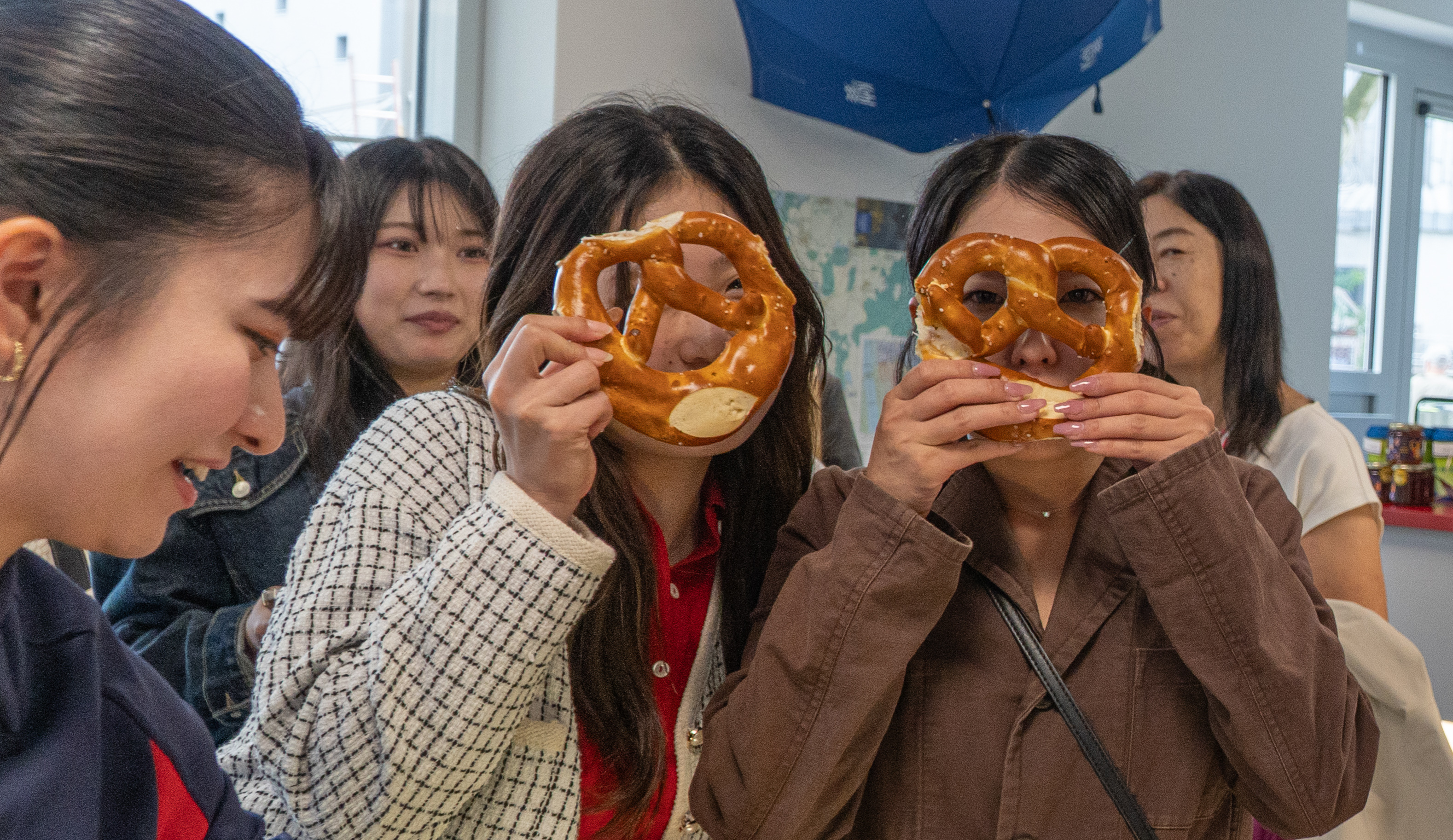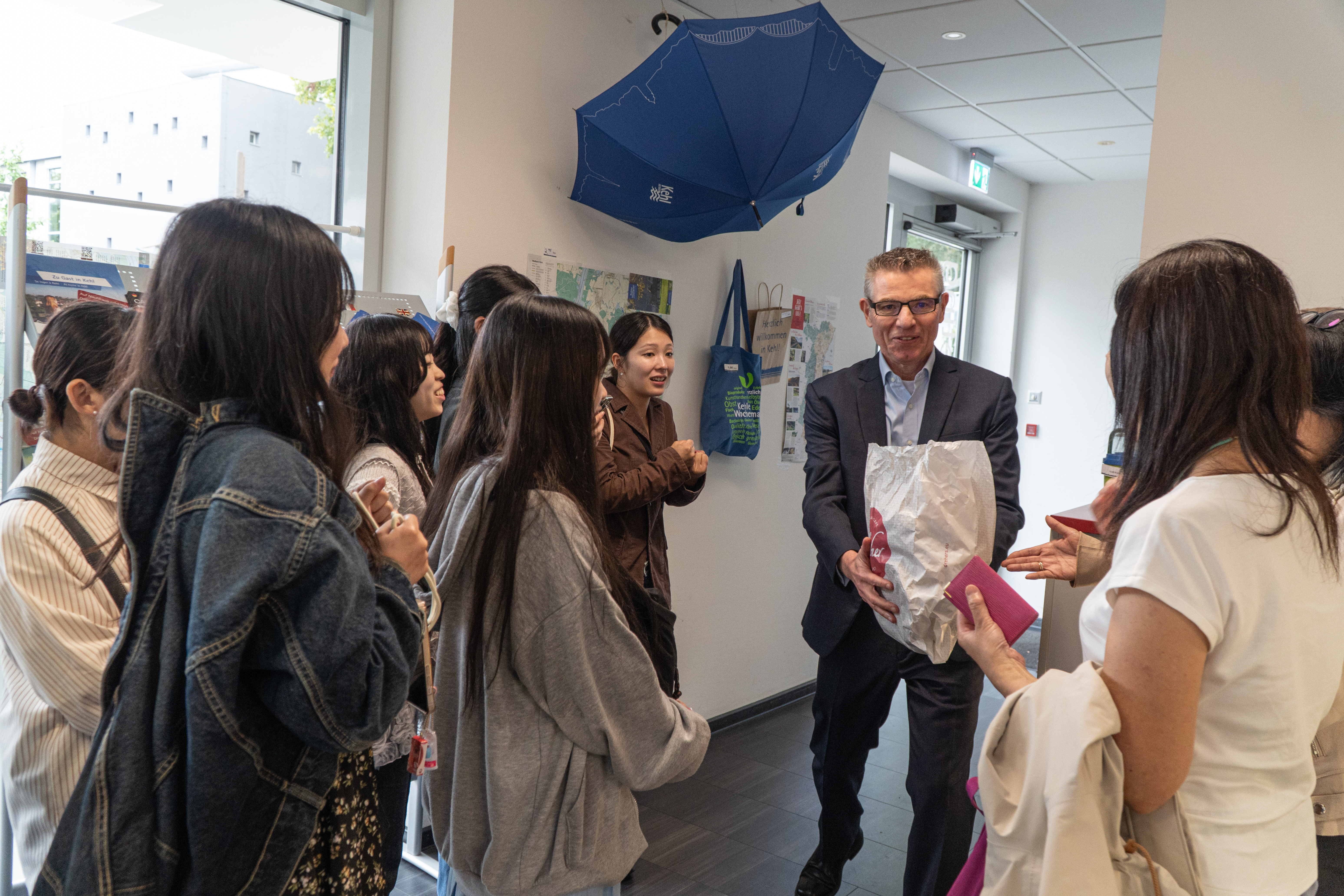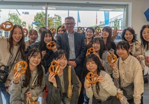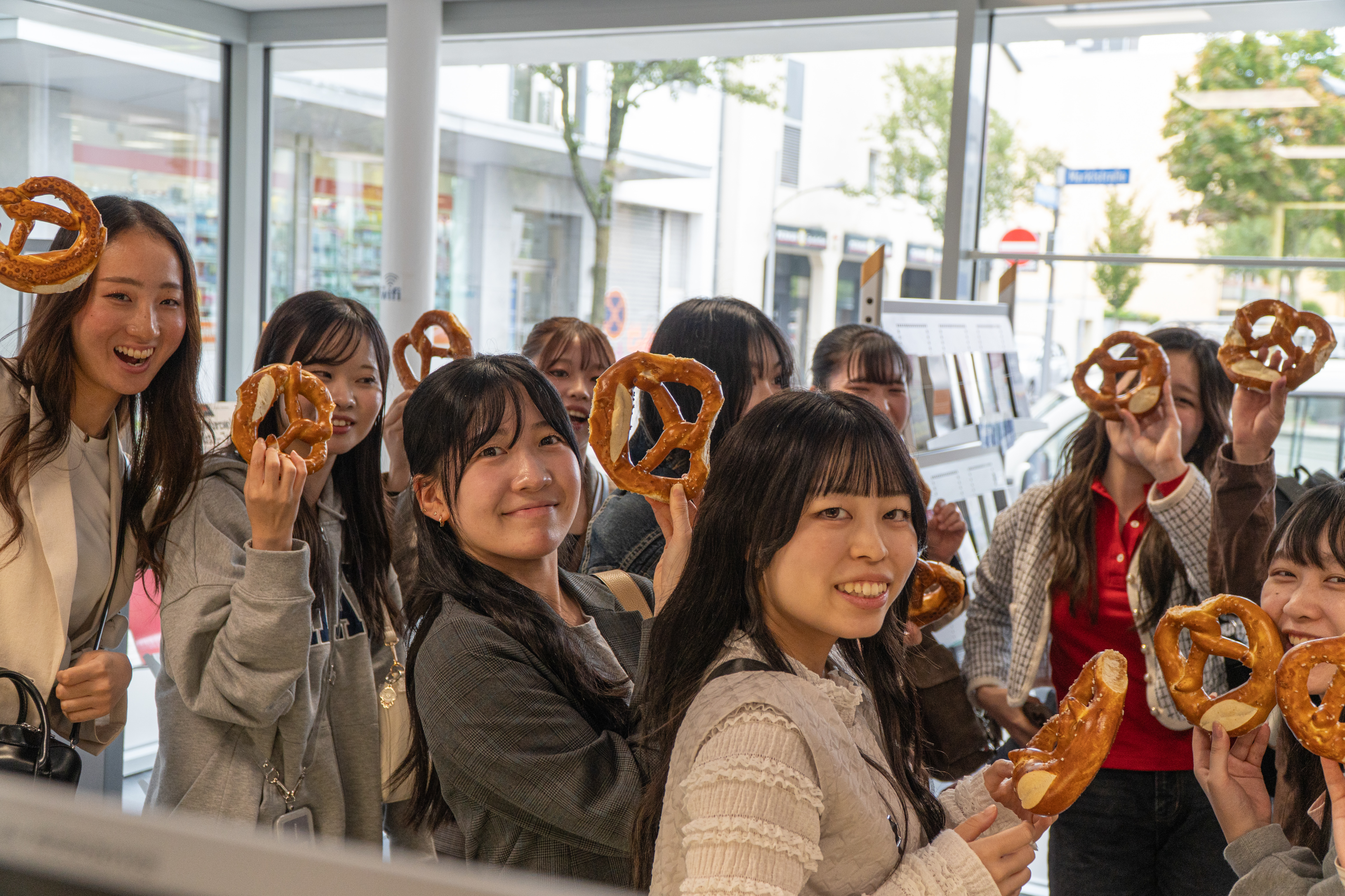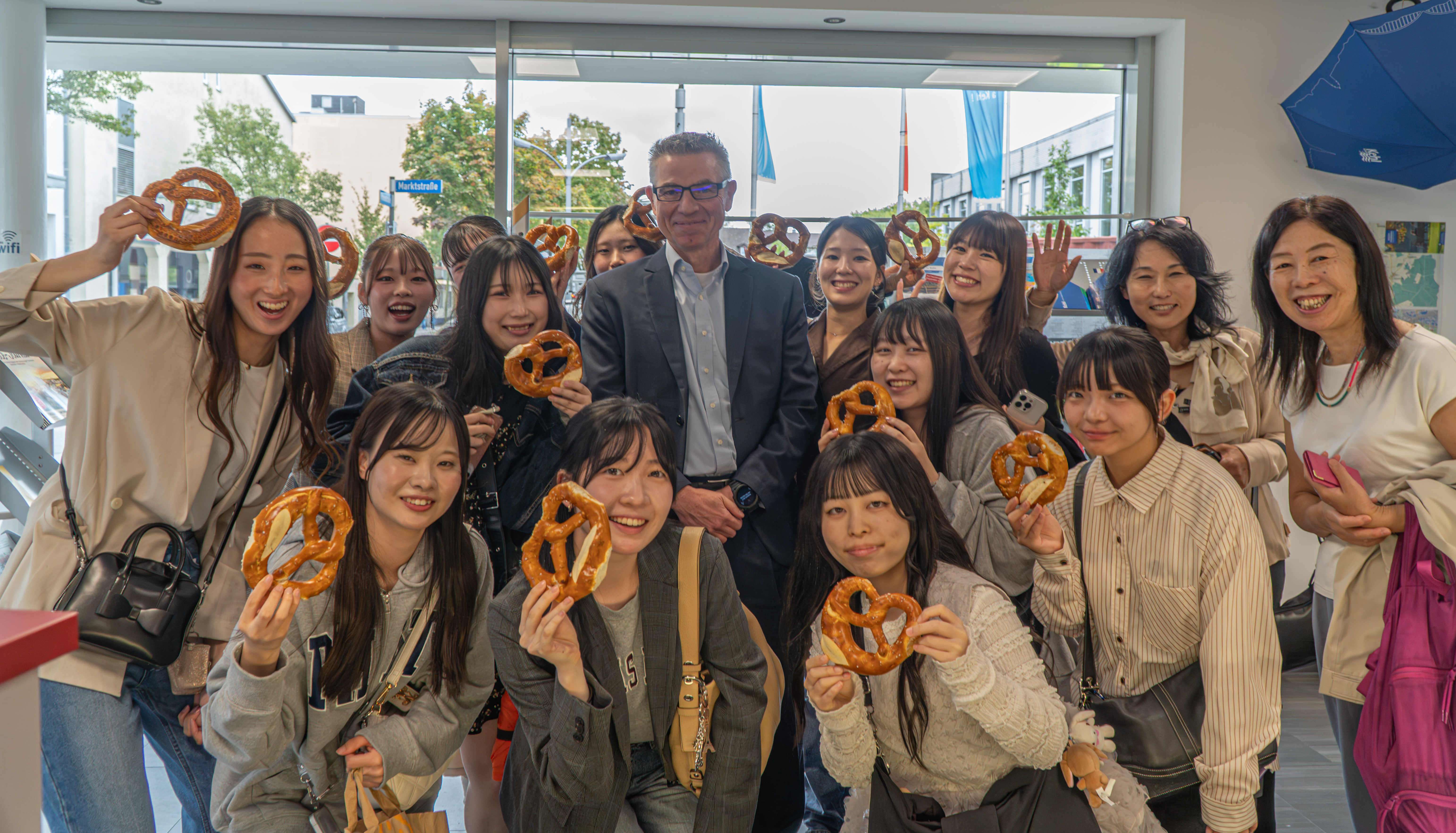Mit einem freundlichen Konichiwa („Guten Tag“ auf Japanisch) empfing Christoph Hodapp die Gäste und reichte zur Begrüßung eine Tüte Brezeln. Das weit über die Grenzen Deutschlands hinaus bekannte Gebäck sorgte gleich für Freude bei den Besucherinnen. Bevor die Studentinnen allerdings hineinbissen, hielten sie den Moment auch gleich mit einem Selfie fest. Erst danach folgten die Fragen, die sie eigens vorbereitet hatten. Denn die jungen Frauen waren nicht nach Europa gereist, um Urlaub zu machen. Sie studieren Tourismus in Tokio und verbringen derzeit eine Woche in Paris. Im Rahmen ihres Aufenthalts stand auch ein Tagesausflug nach Straßburg auf dem Programm, mit einem Abstecher nach Kehl.