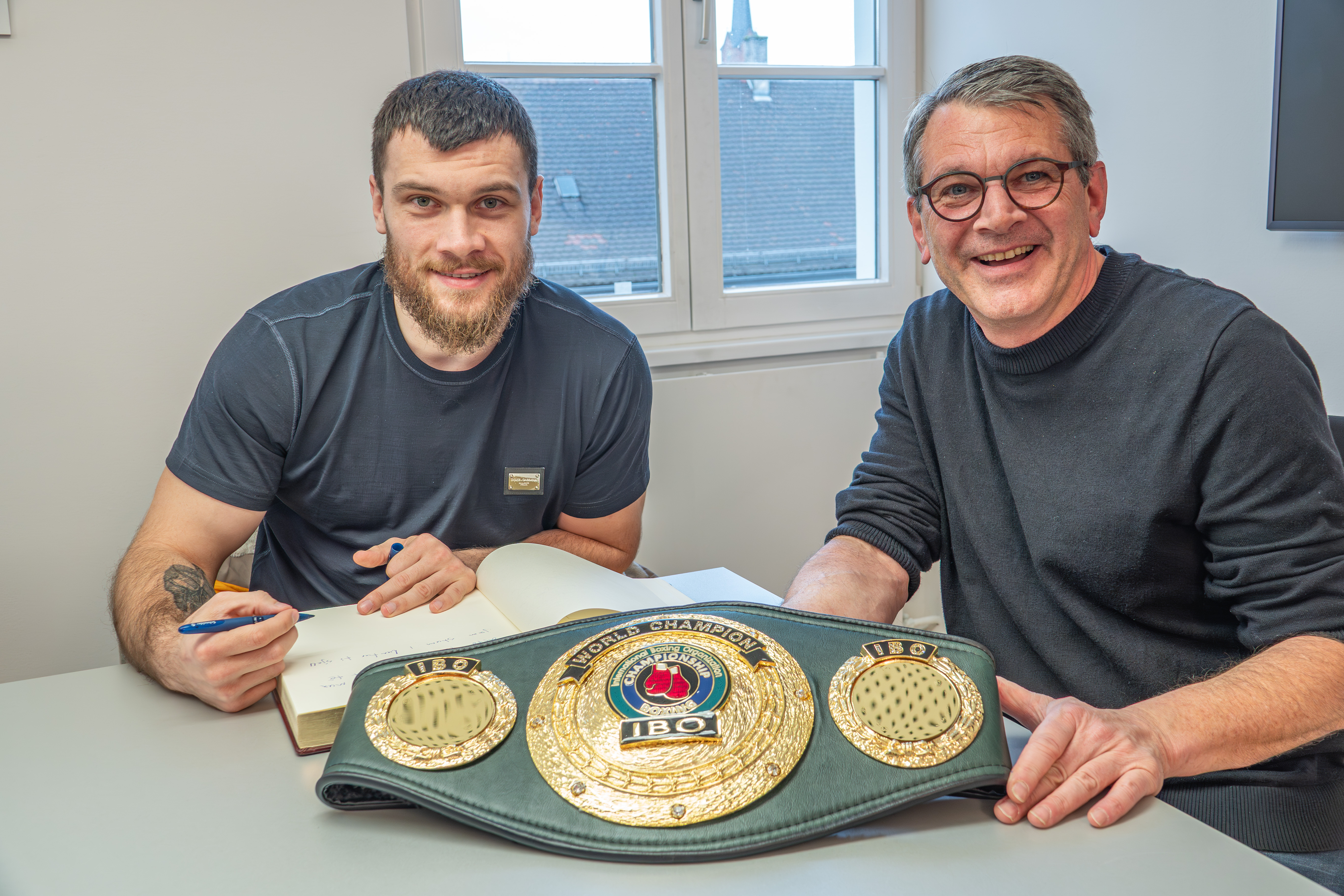 Beim Besuch trug sich der Weltmeister in das Goldene Buch der Stadt ein. Wolfram Britz wies ihn darauf hin, dass er sich damit in prominente Gesellschaft einreihe. Auch Boxlegende George Foreman hatte sich bereits 2016 bei einem Besuch in Kehl in dem Buch verewigt.