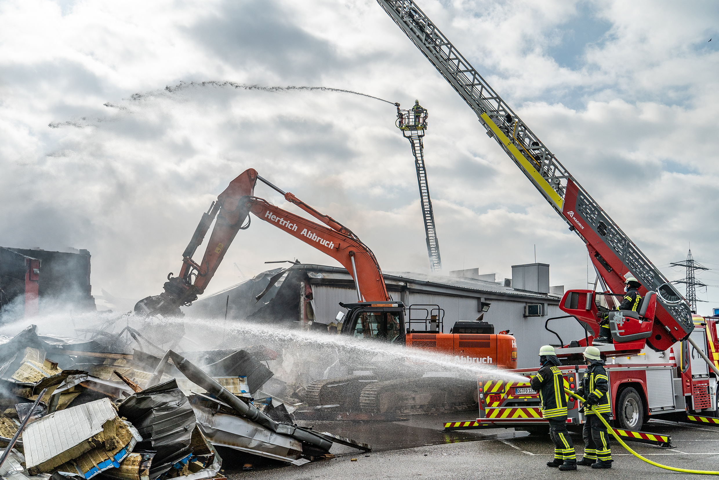 Gegen 10.30 Uhr begann ein Abbruchunternehmen damit, eine Seitenwand zu öffnen, damit die Feuerwehr Zugang zu den Glutnestern im Gebäudeinneren bekam. Das Dach stürzte zu diesem Zeitpunkt bereits in Teilen ein.