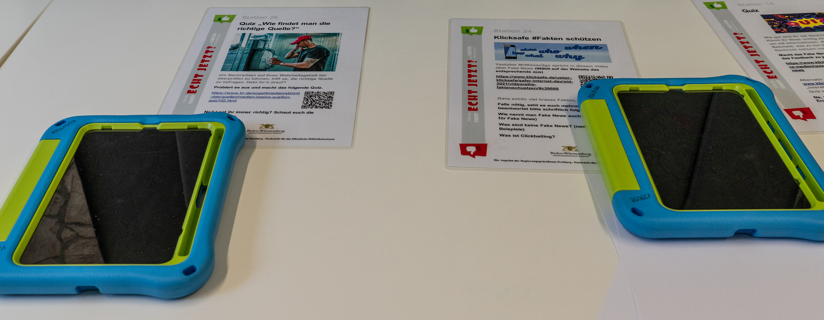 Mediatheksleiterin Sonja Kuhlmann hatte zum Termin das sogenannte Lernbuffet "Echt jetzt?" der Fachstelle für das öffentliche Bibliothekswesen des Regierungspräsidiums Freiburg ausgeliehen. Wie an einem Buffet üblich, konnten sich die Schülerinnen und Schüler im Alter von 13 bis 16 Jahren an sechs Stationen die Aufgaben aussuchen, die sie lösen wollten. So galt es zum Beispiel, aus einer Reihe von zwölf Bildern die Fälschungen herauszufiltern. Das Quiz konnte mehrmals – mit unterschiedlichen Fotos – gemacht werden und die Jugendlichen wurden mit etwas Übung schnell ziemlich treffsicher.
