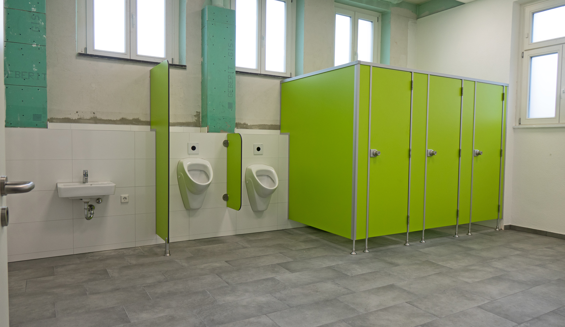 Die Grundschule Sundheim hat das Gebäude der ehemaligen Wilhelmschule im August 2020 und damit inmitten der Corona-Pandemie bezogen. Die Sanitärräume, die sie dort vorfanden, wirkten jedoch alles andere als einladend, weil stark in die Jahre gekommen: Die Kabinen waren eng und übergittert und auch den Fliesen an den Wänden sah man ihr Alter deutlich an. „Einige Kinder warteten deshalb mit dem Toilettengang sogar, bis sie wieder zu Hause waren“, berichtet Anja Weinacker. Weil ursprünglich vorgesehen war, dass die Grundschule Sundheim lediglich zwei bis drei Jahre im Gebäude der ehemaligen Wilhelmschule bleibt, wurde von einer Sanierung der Toilettenräume zunächst abgesehen. Der Wunsch kam wieder auf, „nachdem klar war, dass wir doch länger bleiben müssen“, berichtet Anja Weinacker. In den Sommerferien 2025 begannen schließlich die Umbaumaßnahmen im Erdgeschoss. Rund 150 000 Euro hat die Stadt in die Sanierung investiert. Das Ergebnis: moderne Sanitärräume mit schneeweißen Kacheln und limettengrünen Kabinen. „Wunder-wunderschön und farblich passend zu unseren Klassenzimmern“, freut sich Anja Weinacker. „Es wurden neue Wände eingezogen, neue Türen eingesetzt und neue Waschbecken installiert“, berichtet die Schulleiterin. Auch die unterschiedlichen Körpergrößen der noch heranwachsenden Mädchen und Jungen wurden bei der Ausstattung bedacht: So gibt es etwa niedrigere und höhere Toilettensitze. Auf der Jungentoilette gibt es zusätzlich zwei Urinale in altersentsprechender Höhe.