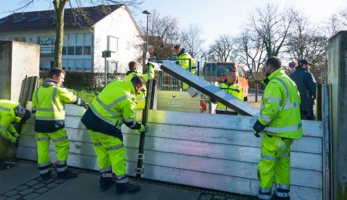 Im Garten der zwei Ufer sind am Donnerstagmorgen (12. März) nacheinander die Dammscharten an der Hagen- und der Gustav-Weis-Straße geschlossen worden. Das kommt eigentlich nur dann vor, wenn das Rheinhochwasser am Pegel im Kronenhof die Meldemarke von fünf Metern erreicht. Allerdings ist der Rhein am Donnerstag in seinem Flussbett geblieben. Stattdessen haben sich Mitarbeitende des Betriebshofs zu einer Übung im Rheinvorland eingefunden.