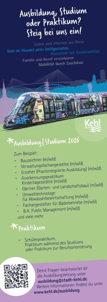 Für Rückfragen stehen Janina Barthel (07851 88-1133) oder Lisa Britz (07851 88-1135) telefonisch oder per E-Mail an ausbildung@stadt-kehl.de zur Verfügung.
