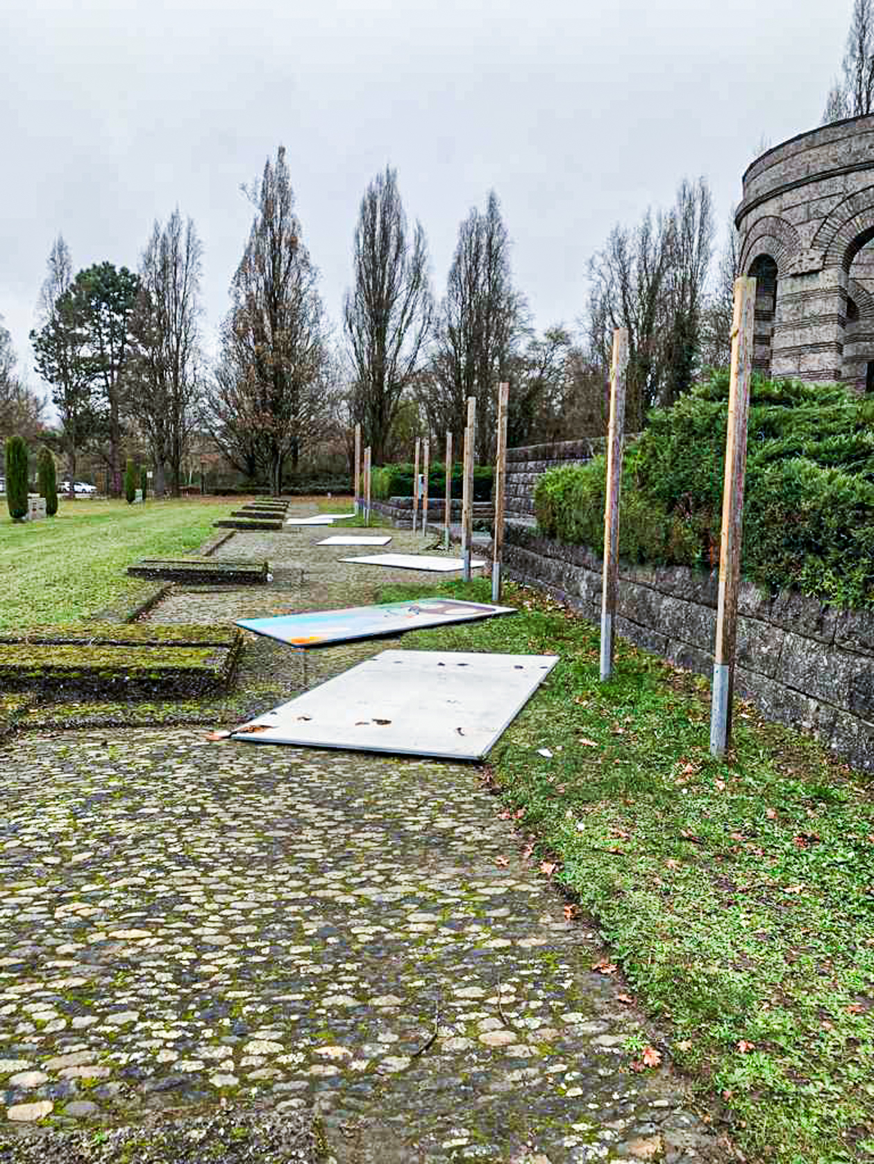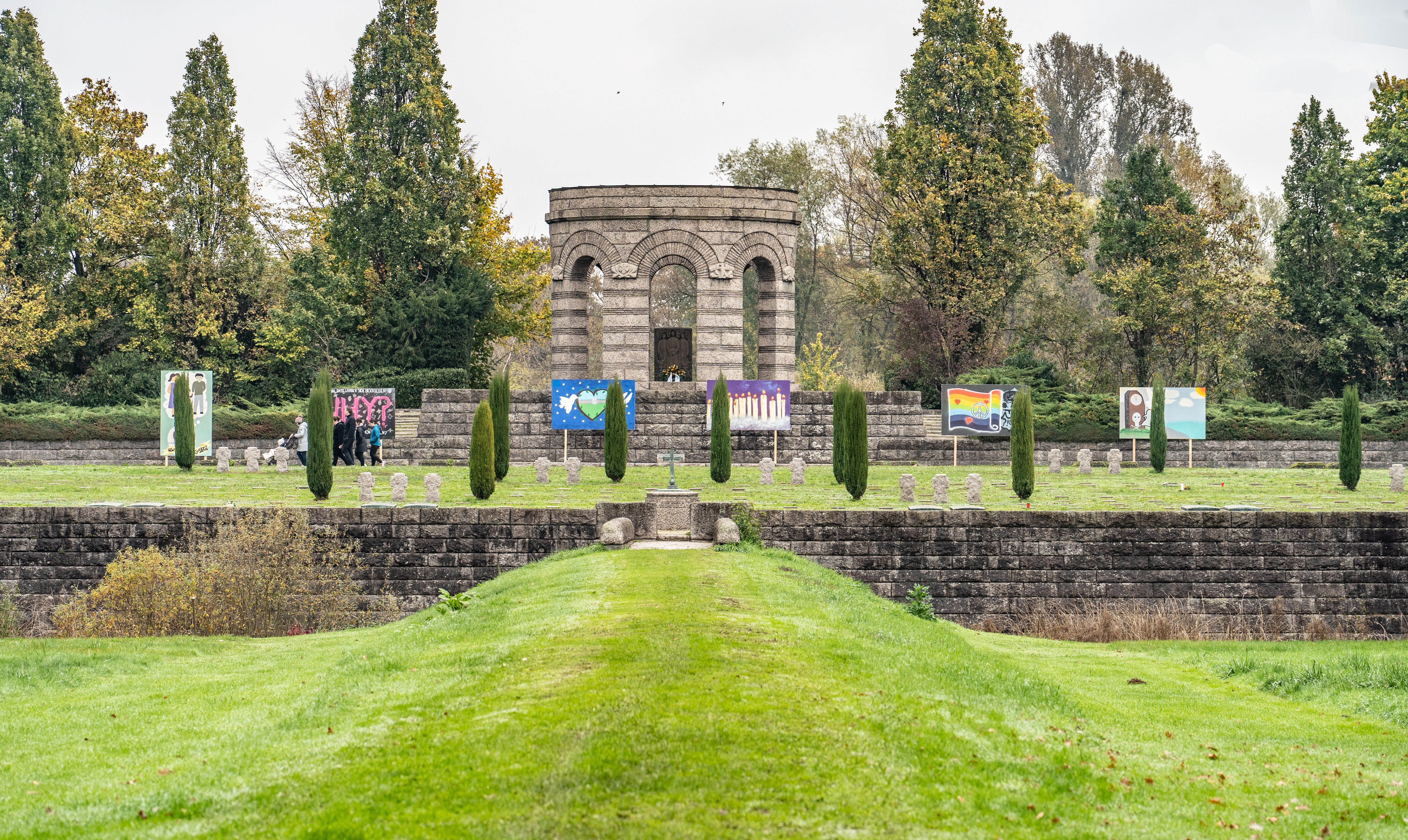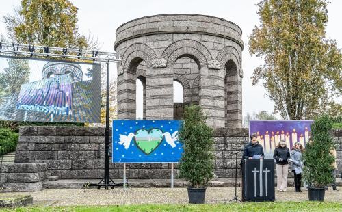 Dass sich die Kriegsgräberstätte seit dem Volkstrauertag 2023 erneut verändert hat, wurde den Besucherinnen und Besuchern der Gedenkveranstaltung bereits beim Ankommen deutlich: Die sechs Graffiti-Platten unterhalb des Rundbaus, welche die Schülerinnen und Schüler des Einstein-Gymnasiums zum Volkstrauertag 2022 gestaltet haben, sind um drei weitere ergänzt worden. Zwei stehen direkt am Eingang von der Kinzigallee her, eine dritte macht Auto- und Radfahrer auf der Ringstraße beziehungsweise dem Kinzigdamm auf diesen besonderen Ort aufmerksam. Ein weiteres neues Element ist eine Hörbox, über die sechs Zeitzeugenberichte von Menschen abgerufen werden können, die von ihren Angehörigen erzählen, die auf diesem Friedhof begraben liegen. Außerdem gibt es Informationen zur Entstehungsgeschichte der Kriegsgräberstätte sowie zu ihrem Architekten Robert Tischler.