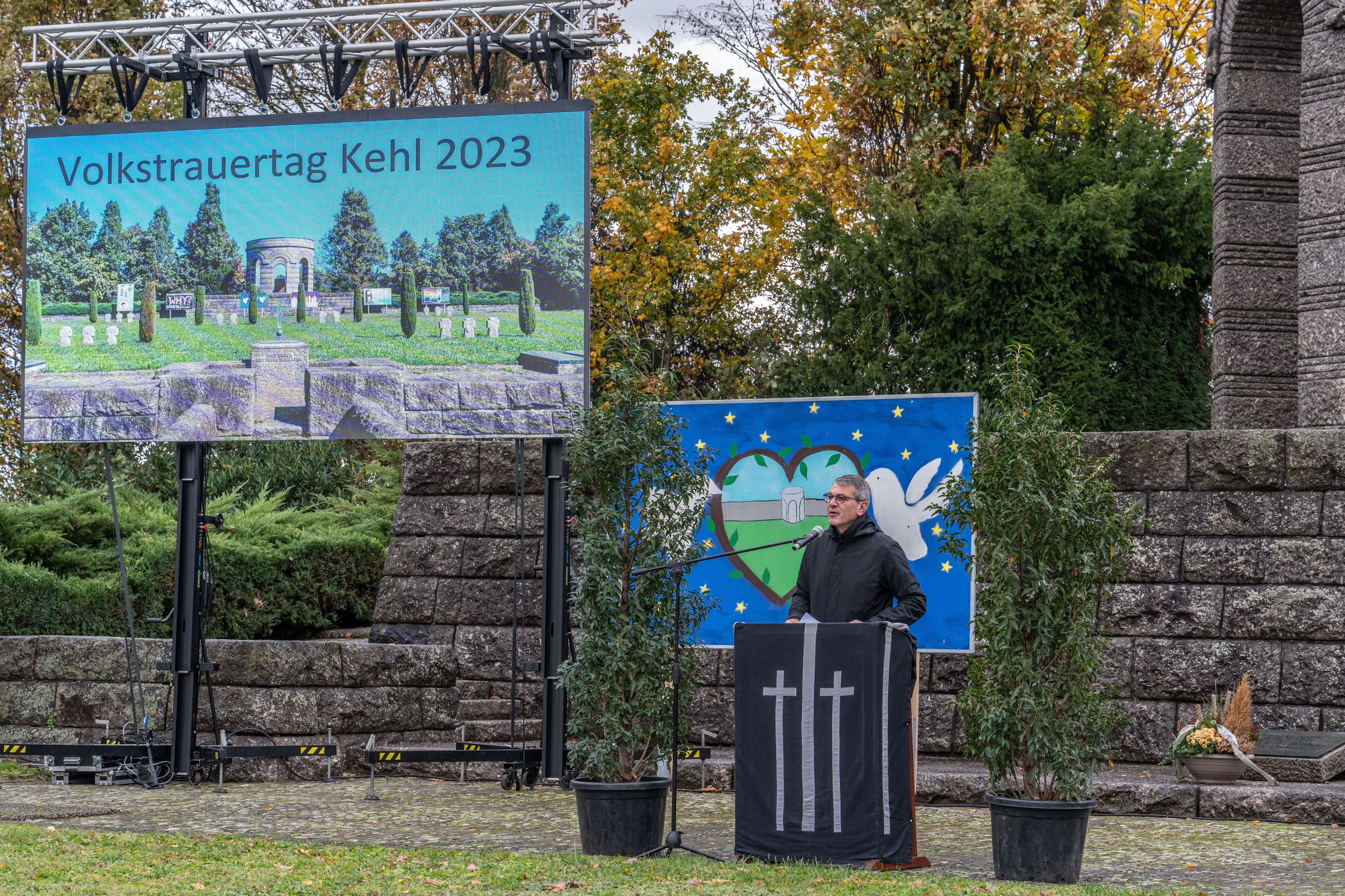 „Hier auf der Kehler Kriegsgräberstätte liegen mehr als 2100 Kriegstote begraben. Bis auf die Namen und Lebensdaten auf den Grabplatten, soweit sie bekannt sind, hat der Ort selbst keine Auskunft über die Menschen gegeben. Deshalb war und ist es unser Ziel, allen, die die Kriegsgräberstätte aufsuchen, mehr Informationen zu liefern, über die Entstehung dieses Friedhofs, über den Architekten und sein Werk und nicht zuletzt über die hier begrabenen Kriegstoten. Die Hörstation am Eingang mit ihrer Tafel will dazu beitragen. Sie enthält auch Erinnerungen von Angehörigen, aufgezeichnet an einem Küchentisch in Kehl oder im Altersheim in Rüsselsheim, von Menschen, die heute am Volkstrauertag hierhergekommen sind, aber auch von Angehörigen, die zwischenzeitlich leider verstorben sind. Auch wenn ihre Erinnerungen nur ein Bruchteil sind angesichts der großen Zahl der Toten, schaffen sie es vielleicht trotzdem, eine abstrakte Zahl anschaulich zu machen.“