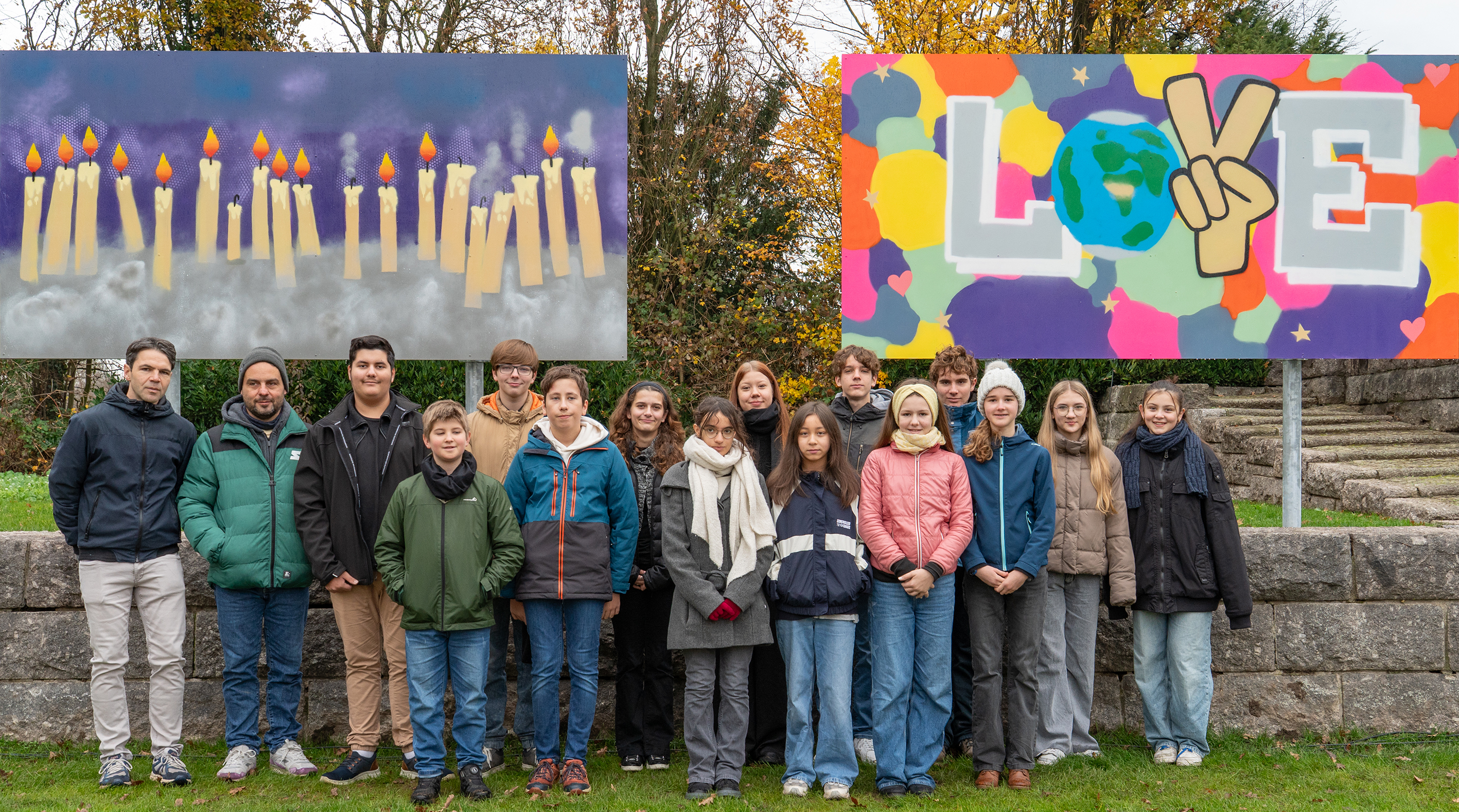 Die zweite Wand greift diesen Gedanken auf: „In der Dunkelheit sprühe ich … Frieden … auf die Mauern meiner Zeit.“ Die zweite Wand bildet zugleich einen Gegensatz zur ersten. Vor dem Hintergrund einer Mauer heben sich die aufgesprühten Bilder und Wörter in vielen Farben ab. Deutlich ist ein dicker, blühender Baum zu sehen auf einem grünen Hügel. Die Mauer wird zur Fläche, um ein Zeichen zu setzen: Wir wollten das Wort „Frieden“ in unterschiedlichen Sprachen festhalten. Die bunten Wörter bedeuten alle dasselbe. Sie brauchen keine Übersetzung. Wer die Sprache nicht kennt, wird vielleicht neugierig. Wer die Sprache spricht, wird ein vertrautes Wort entdecken. In Frieden zu leben, bleibt dabei das Ziel und der Wunsch von Menschen auf der ganzen Welt, egal welche Sprache sie sprechen. Die Kriegsgräberstätte in Kehl und ihre tausenden Kriegstoten erinnern bis heute daran, was die Folgen sind, wenn das nicht gelingt.
