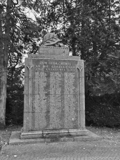 Das Kriegerdenkmal für die Gefallenen des Ersten Weltkriegs wurde am 7. September 1924 eingeweiht. Der Beginn des Weltkriegs lag damals etwas mehr als 10 Jahre zurück. Die ursprünglich für Anfang August geplante Einweihungsfeier musste wegen Verzögerungen bei den Bildhauerarbeiten auf den Septembertermin verlegt werden. Auch zuvor hatte es bereits Probleme gegeben: Im Krisenjahr 1923 musste die Gemeinde die Ausführung des Denkmals wegen Zahlungsschwierigkeiten infolge der Hyperinflation unterbrechen lassen.