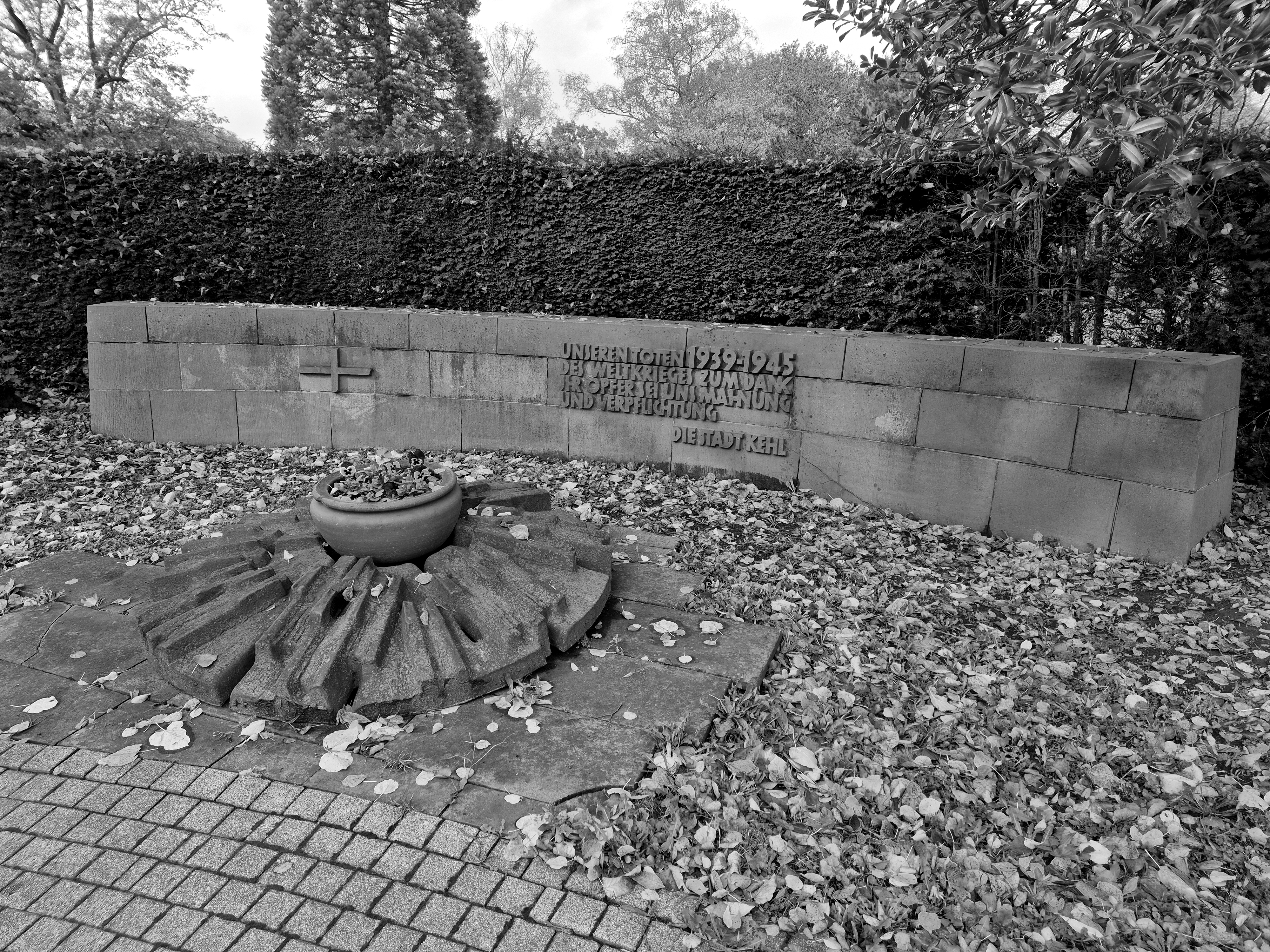 Das Mahnmal für die Kriegstoten und Vermissten des Zweiten Weltkriegs wurde am Sonntag, den 17. Juni 1962 eingeweiht. Dies geschah unter großer Anteilnahme der Kehler Bevölkerung. Damals lag das Ende des Zweiten Weltkrieges 17 Jahre zurück und die Mehrheit der Einwohner hatte den Krieg noch unmittelbar selbst erlebt, ob als Zivilist oder Soldat. Das Mahnmal sollte an 719 Kriegstote und Vermisste aus Kehl erinnern, deren Namen im Vorfeld gesammelt worden waren. Die Zahl entsprach mehr als einem Zwanzigstel der Bevölkerung der Rheinstadt in der Kriegszeit. Ganz überwiegend handelte es sich um die Namen gefallener oder vermisster Soldaten, daneben wurden auch 38 im Krieg getötete Kehler Zivilisten aufgeführt.