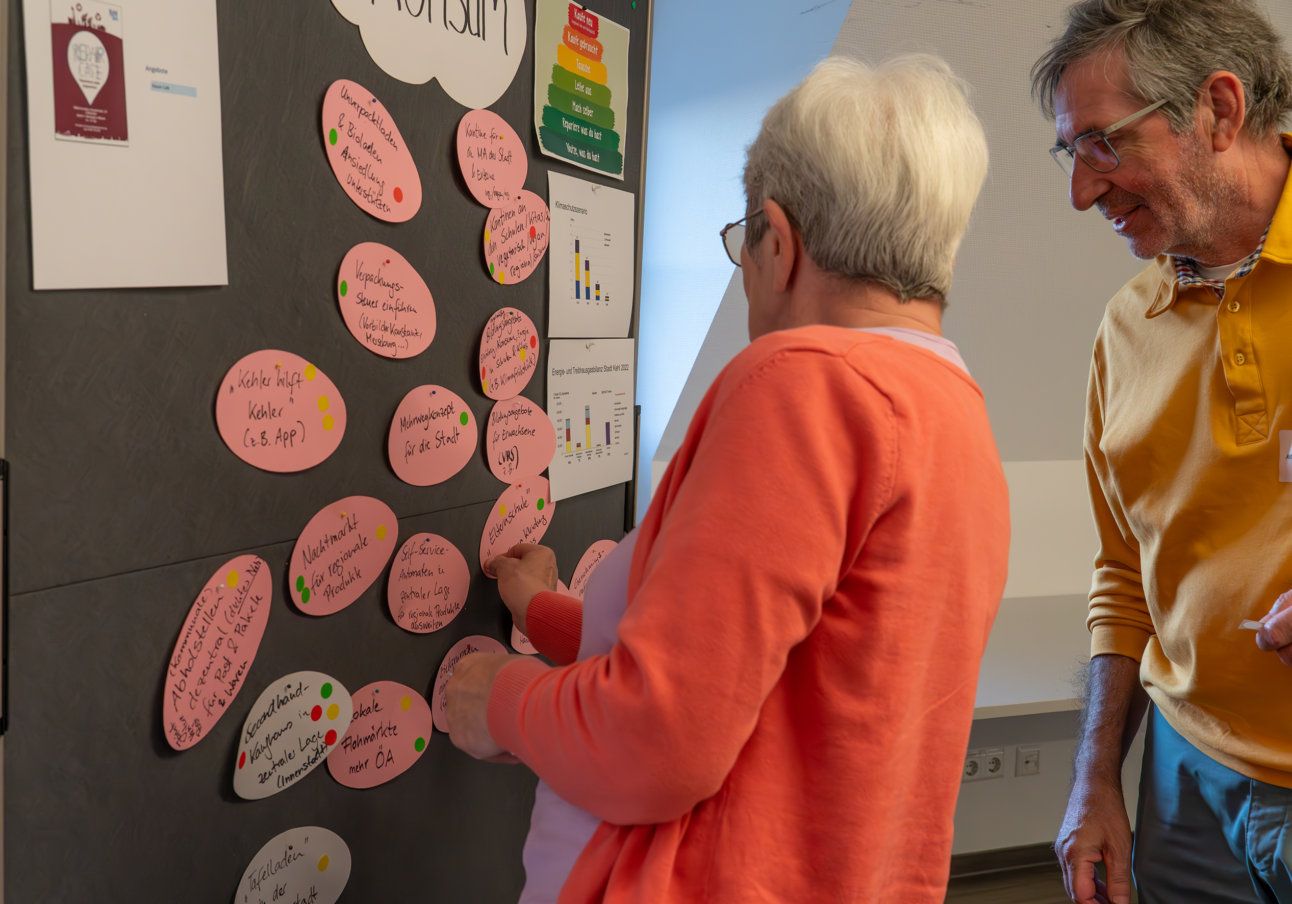 Zahlreich waren die Ideen auch dazu, wie die Wirtschaft ihren Beitrag zum Klimaschutz leisten – und dabei auch unterstützt werden könnte. So könnten Unternehmen mit Sonderabschreibungsmöglichkeiten dazu motiviert werden, ihre Gebäude zu dämmen und Photovoltaikanlagen aufs Dach zu setzen. Fördermittel für den Austausch oder die Optimierung der Heizkessel oder eine Verdopplung der Einspeisevergütung für Solarstrom könnten ebenfalls einen Schub bringen, meinen Teilnehmende an der Klimawerkstatt. Mobilitätsstationen im Umfeld von Unternehmen, kostenlose Monatskarten für den Öffentlichen Nahverkehr für die Mitarbeitenden und ein von den Firmen eingerichteter Carsharing-Pool könnten dazu beitragen, die vom motorisierten Verkehr herrührende Luftbelastung zu reduzieren.