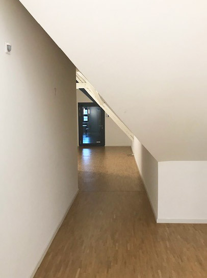 Der Projektraum im Dachgeschoss ist über einen Flur erreichbar, der von einer Dachschräge verengt wird. An der engsten Stelle hat der Flur bis zur Höhe von 90 cm eine Breite von 143 cm, auf einer Höhe von 160 cm wegen der Dachschräge nur noch 77 cm. Die Tür zum Projektraum öffnet sich automatisch.