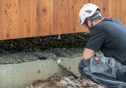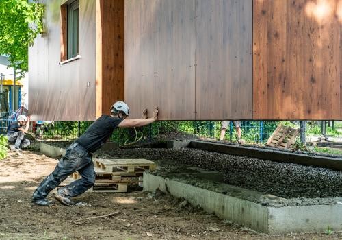 „Runter, runter, runter“, ruft der vielstimmige Kinderchor, doch ganz so einfach ist die Sache nicht. Mitarbeiter von Holzbau Brett drehen Gewindestangen in vorbereitete Kanäle in den Gebäudewänden, die exakt in die Höhlen im Fundament auf dem Kita-Gelände passen. Diese wurden zuvor mit sogenanntem Quellmörtel gefüllt, der sich nicht zusammenzieht, sondern ausdehnt, wenn er erkaltet und fest wird. Quellmörtel ist kissenartig auch auf den Rest des Betonrahmens aufgebracht, auf den das Haus aufgesetzt wird. Der Mörtel füllt die Windungen der Stangen und die Fugen des Häuschens aus und verfestigt sich, so dass das Tiny House unverrückbar feststeht – und nicht, wie der vierjährige Beobachter mutmaßt, „dann bald wieder abgeholt“ wird.