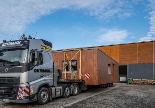 Eskortiert von zwei Polizeibeamten auf Motorrädern verlässt der Tieflader mit dem 50 Quadratmeter großen Tiny House am Dienstagmorgen langsam den Hof der Firma Brett und macht sich auf den Weg nach Goldscheuer. Während der Schwertransport die beiden Kreisverkehre gut meistert, wird es bei der Anfahrt zum Spatzennest eng: Die Verkehrszeichen in der Kittersburger Straße sind einbetoniert und lassen sich nicht entfernen. Mit einigem Ruckeln gelingt es den erfahrenen Begleitern des Schwertransports sie so zur Seite zu neigen, dass das Tiny House unbeschädigt passieren kann.