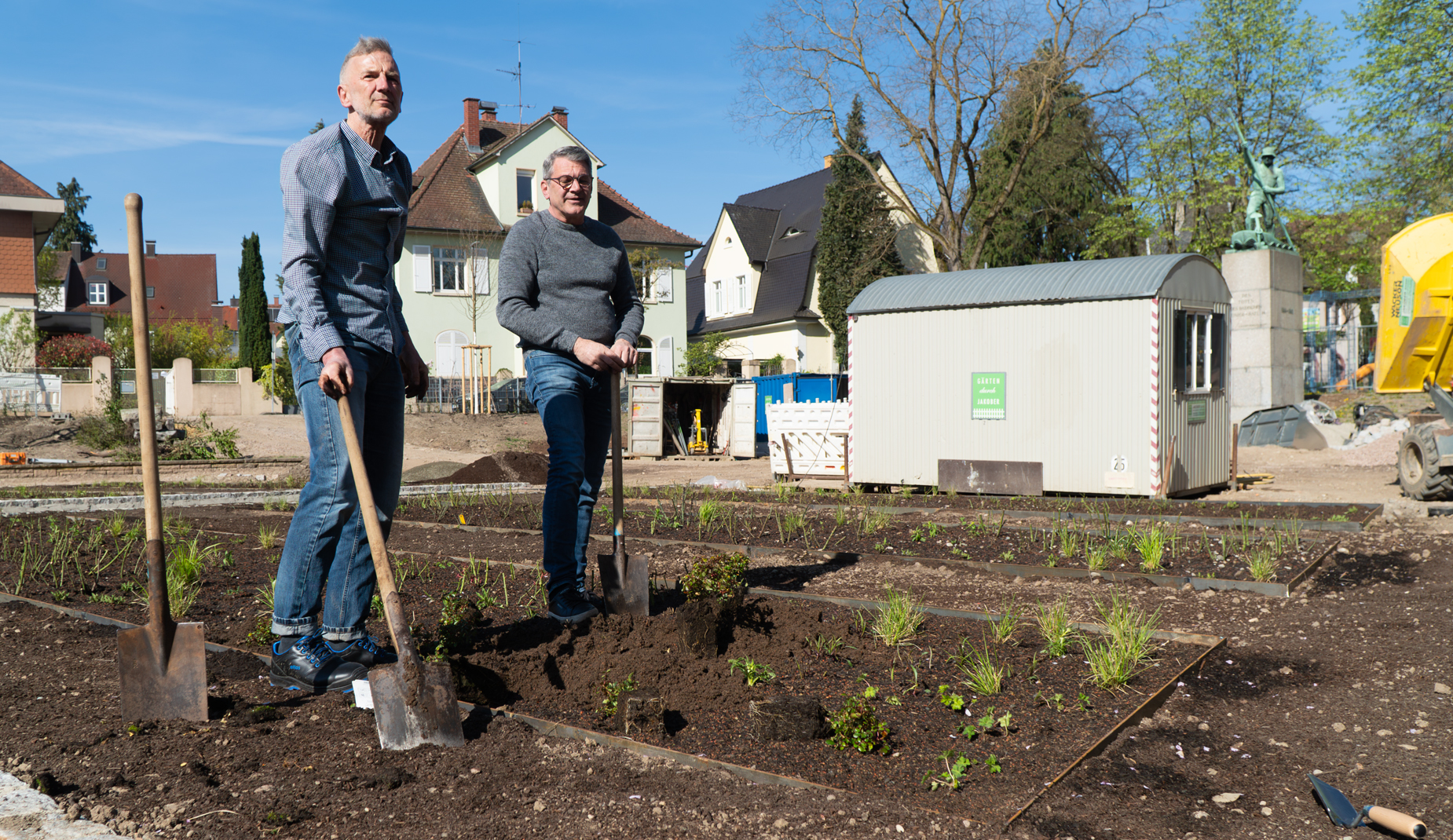Von „Schneeflocke“ über „Medley Pastel“ bis „Kesse Lippe“ – für die Bepflanzung wurden spezielle Rosenarten aus dem renommierten Rosarium in Baden-Baden bestellt. Ausgewählt wurden besonders widerstandsfähige, pflegeleichte und an den Standort angepasste Sorten. Ergänzend werden neue Blumen und Stauden gepflanzt. Frank Wagner freut sich auf das farbenfrohe Zusammenspiel: „Wenn dann alles blüht, wird es richtig schön bunt“, sagt er. Darüber hinaus werden 20 zusätzliche Jungbäume gepflanzt. Sie sollen künftig für mehr Schatten sorgen – ein Wunsch, der im Rahmen der Bürgerbeteiligung mehrfach geäußert wurde. Vor dem Hintergrund zunehmender Hitzetage soll die zusätzliche Beschattung einen Beitrag zur Aufenthaltsqualität leisten.
