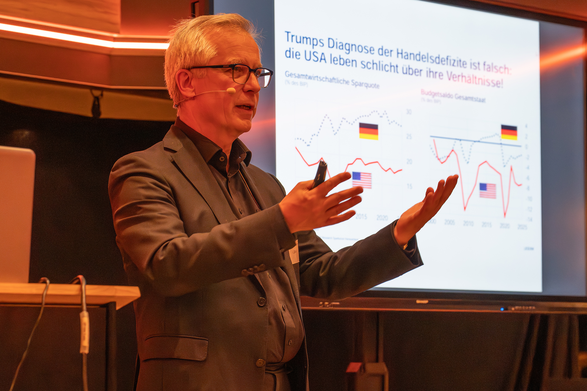 Die von der schwarz-roten Regierung angestrebten Verteidigungsausgaben seien ebenso wenig realistisch wie die Ziele im Bereich des Bauens, kritisierte der Volkswirt. Der Bauwirtschaft fehlten die Fachkräfte und Besserung sei nicht in Sicht: 2024 hätten erstmals mehr Menschen die EU verlassen, als eingewandert seien. Arbeitskräfte gingen in ihre Heimat zurück – beispielsweise nach Polen –, weil es dort ganz gut laufe und die Willkommenskultur bei uns zu wünschen übriglasse.
