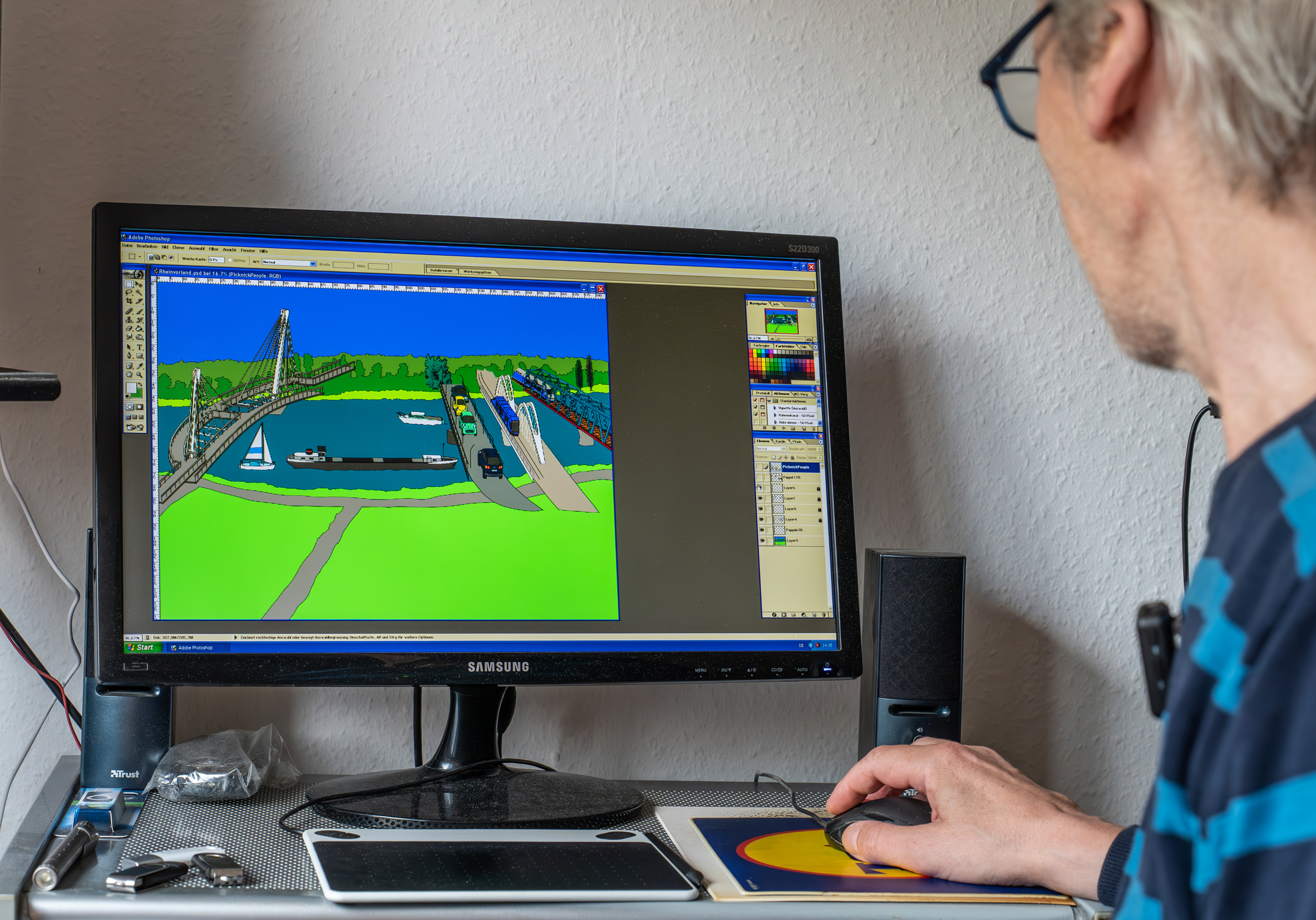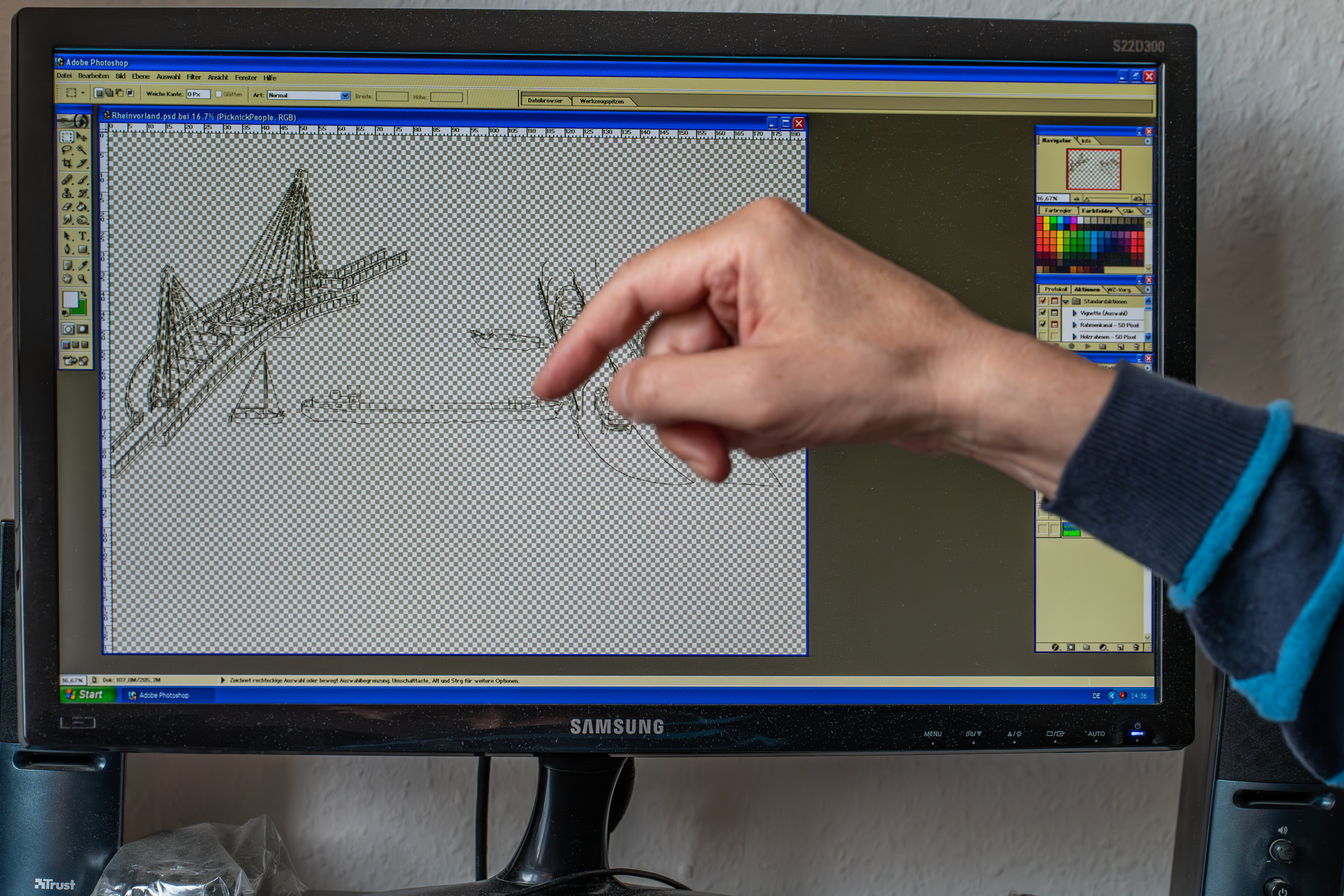 In den Fastnachtsferien hat Michael Dreilich, der an vier Schulen in Kehl, Baden-Baden und Iffezheim als externe Lehrkraft Musik unterrichtet, mit dem Zeichnen begonnen, inzwischen ist das Titelbild fertig – die Nepomuk-Kirche mit Altrhein und Seebühne, wo passender Weise gerade eine Veranstaltung des Kultursommers stattfindet. Der Kehler Teil des Gartens der zwei Ufer mit den vier Brücken ist ebenfalls schon weit gediehen; auf der Wiese sitzen bereits Menschen beim Picknick, Kinder spielen Ball oder fahren Skateboard. Ein Junge und ein Mädchen, die – meist gemeinsam – mit ihrem Board unterwegs sind, gehören zu den Figuren, die gefunden werden wollen. Mehr als Hundert Personen tummeln sich bereits. Alle hat Michael Dreilich zunächst schwarz-weiß gezeichnet, dann freigestellt, im Bild platziert und dann coloriert. Nur kurz hat er den Versuch unternommen, die Frauen, Männer und Kinder von KI zeichnen zu lassen und die Ergebnisse gleich wieder verworfen: Die Gesichter waren zu schematisch und gleichförmig.