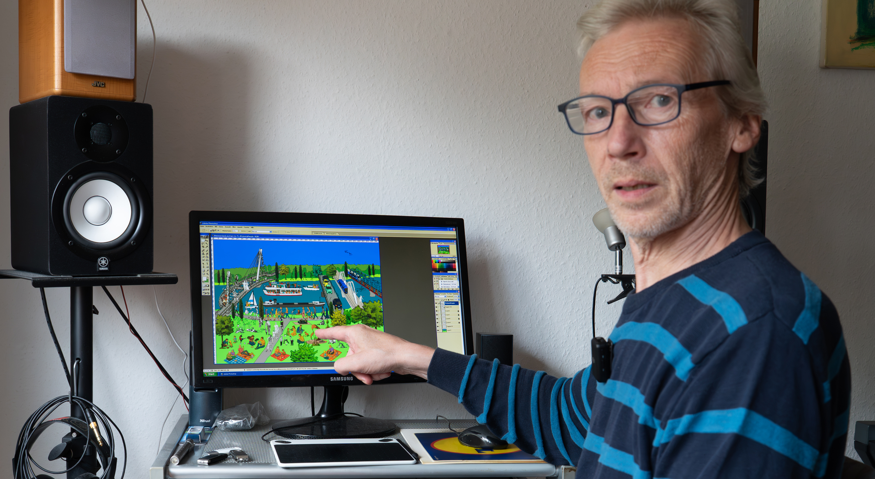 Der Zeichner und Musiker Michael Dreilich wurde vor 63 Jahren in Kehl geboren und ist in der Rheinstadt bekannt geworden, als er für die grenzüberschreitende Gartenschau 2004 die Geschichte vom blauen Paul als begehbares Kinderbuch gestaltet hat. Die großflächigen Zeichnungen sind damals noch in reiner Handarbeit entstanden. Das Kinderbuch, das einen Raum im Haus der Jugend füllte, zog auch Erwachsene in seinen Bann. Nach der Gartenschau ging der blaue Paul auf Wanderschaft: zunächst für zwei Monate in die Stadtbibliothek in Lahr, dann erfreute es sechs Monate lang die jüngeren Besucherinnen und Besucher der Landesgartenschau in Heidenheim und war schließlich noch mehrere Monate im Indoor-Spielplatz Sensapolis in Böblingen aufgebaut. Danach hat der Künstler sein Werk der Bürgerstiftung überlassen.