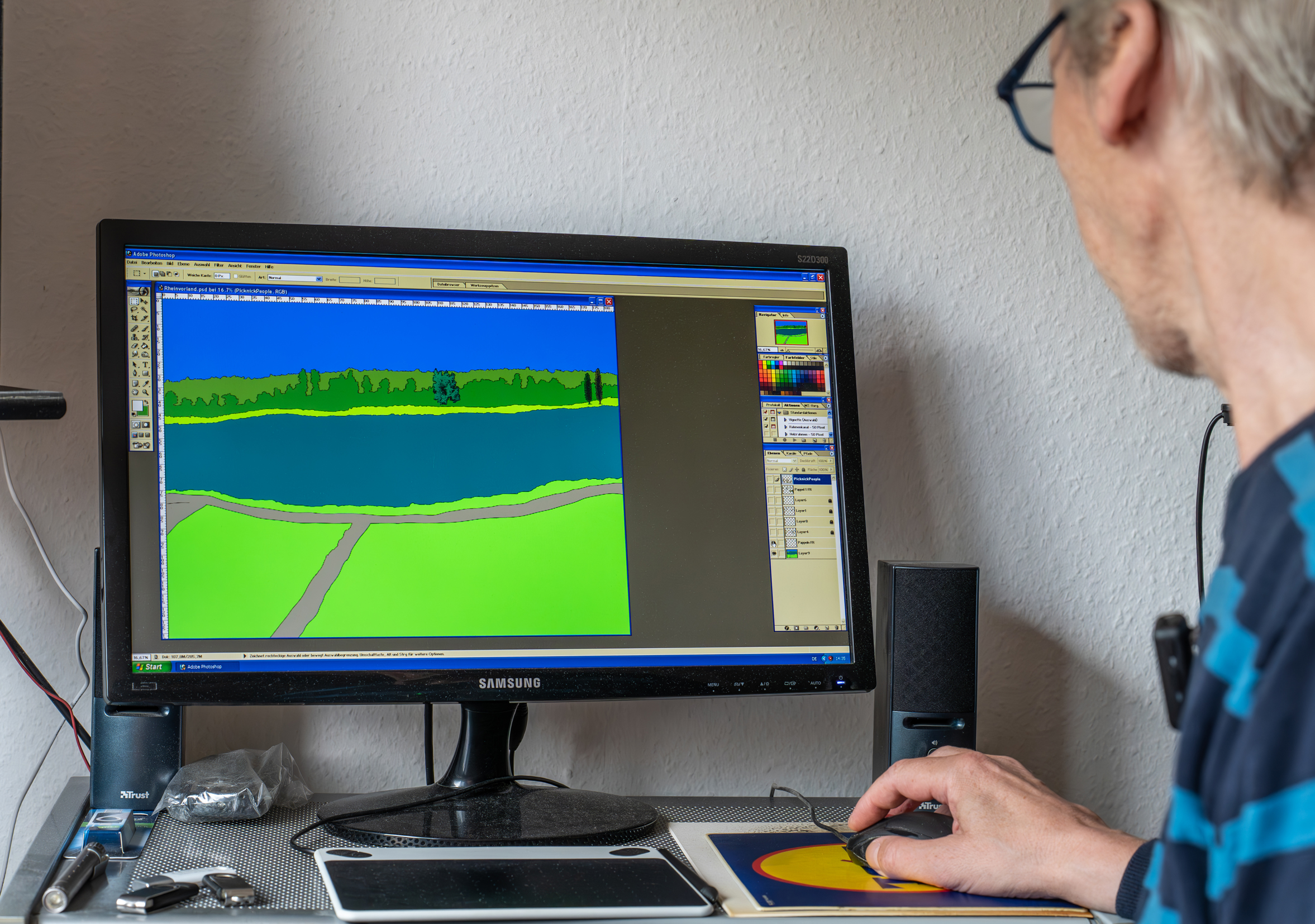 Michael Dreilich zeichnet am Tablet, draußen und bei sich zu Hause am Schreibtisch. Nur noch selten ist er, wie früher üblich, mit dem Skizzenblock unterwegs. Die Basis für die Hintergrundbilder sind digitale Strichzeichnungen in Schwarz-Weiß. Das gilt für den Weißtannenturm ebenso wie für das Sundheimer Huhn – eines der typischen Kehler Tiere, die sich in den Szenerien auf den Doppelseiten des Buches verstecken. Es folgt die Reinzeichnung, coloriert wird später. Alles passiert am Tablet oder am PC.